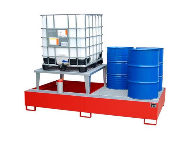 Gelakt stalen of verzinkte opvangbak voor 1 x 1000 liter IBC en 4 x 200 liter vat. 3 mm staalplaat met verzinkt rooster en tapplateau.
