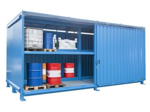 Zeer degelijke MIG gelaste opslagkluis uit gelakt staalplaat met 5mm dik stalen lekbak. Aan beide zijden bedienbaar en met 2 opstelniveaus. Geschikt voor 12 stuks IBC. Buitenopslag conform PGS 15.